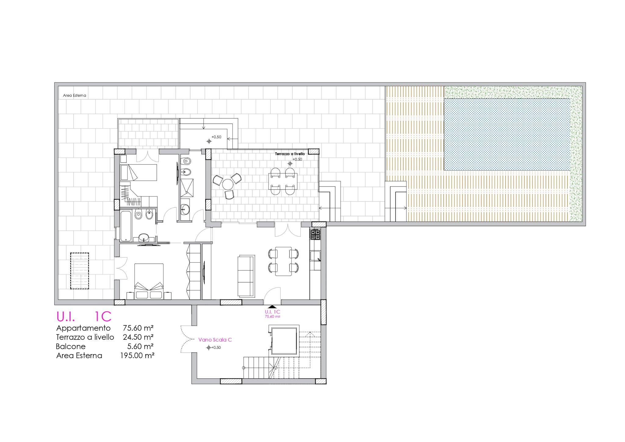 I piani rialzati godono di un'area esterna privata, ampio giardino attrezzato con piscina interrata creando una zona relax esclusiva e personalizzata. I trilocali sono caratterizzati da spazi ben distribuiti, composti da ampio living-cucina dante su terrazzo a livello, due camere da letto e doppio accessorio.